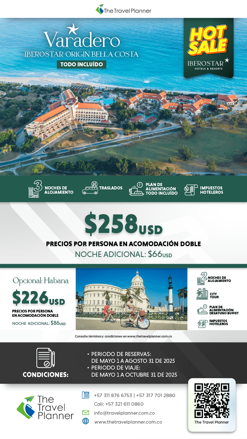 Disfruta de una escapada tropical en las playas de Varadero alojándote en el hotel Iberostar Origin Bella Costa con todo incluido. Este plan especial te ofrece 3 noches con alimentación completa, traslados y todos los impuestos hoteleros cubiertos, por solo $258 USD por persona en acomodación doble.