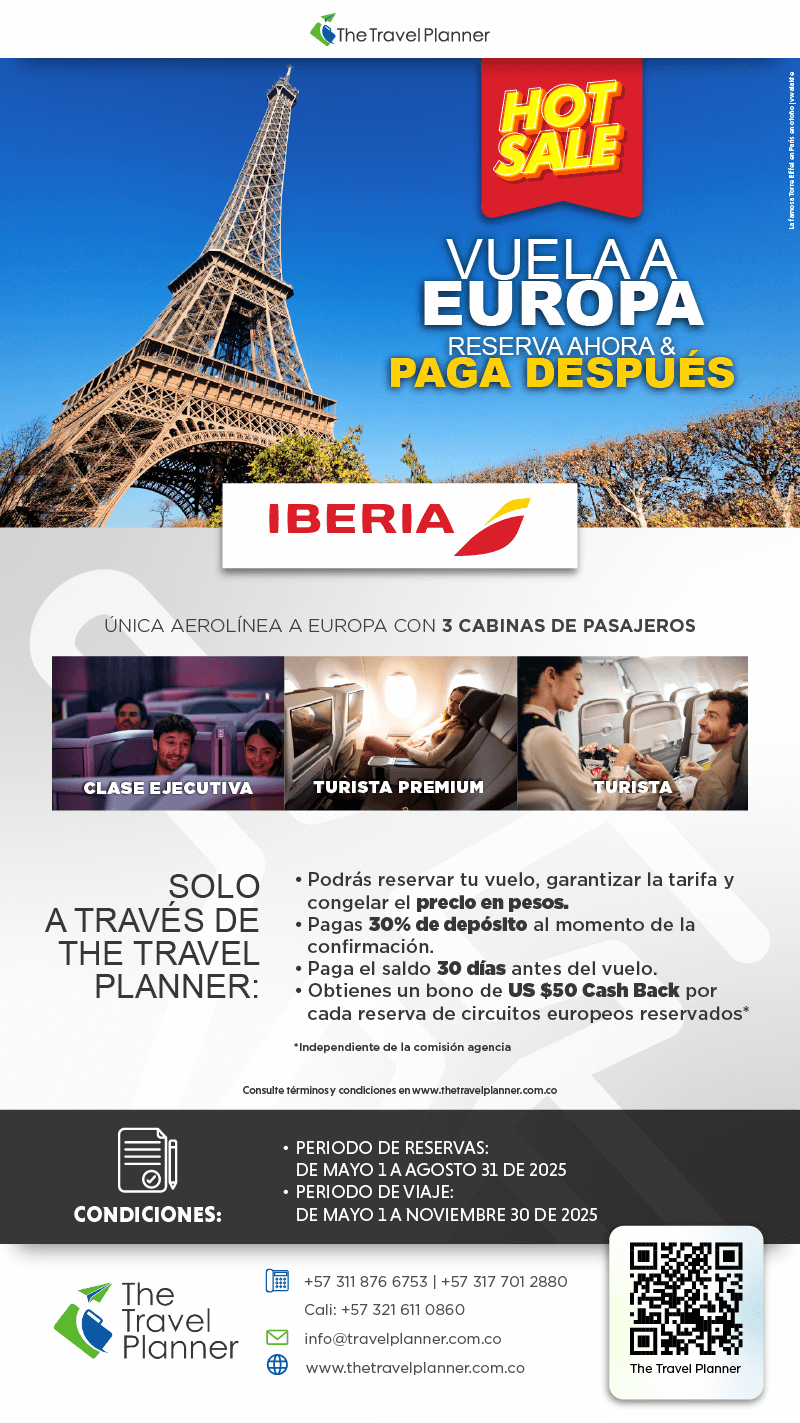 Explora Europa con total flexibilidad viajando con Iberia, la única aerolínea con 3 cabinas de pasajeros: Ejecutiva, Turista Premium y Turista. Reserva ahora y paga solo el 30% para garantizar tu tarifa. Congela el precio en pesos y paga el saldo 30 días antes del vuelo.